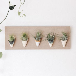 The Carter + Rose ceramic and wood wall planter can hold air plants, dried flowers or artificial plants, adding greenery to any room. Planters are handmade out of a variety of Oregon clay, hand painted, and then secured to a wooden backing. Each wall planter has a self leveling hanger on the back for easy hanging.