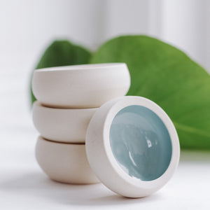 The perfect tiny bowl to hold your jewelry or knickknacks! The exteriors are sanded raw porcelain with a glossy glazed interior.