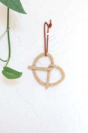 Made of speckled buff clay with just a sprinkle of "salt" these pretzel ornaments are a delightful gift for the foodie in your life.